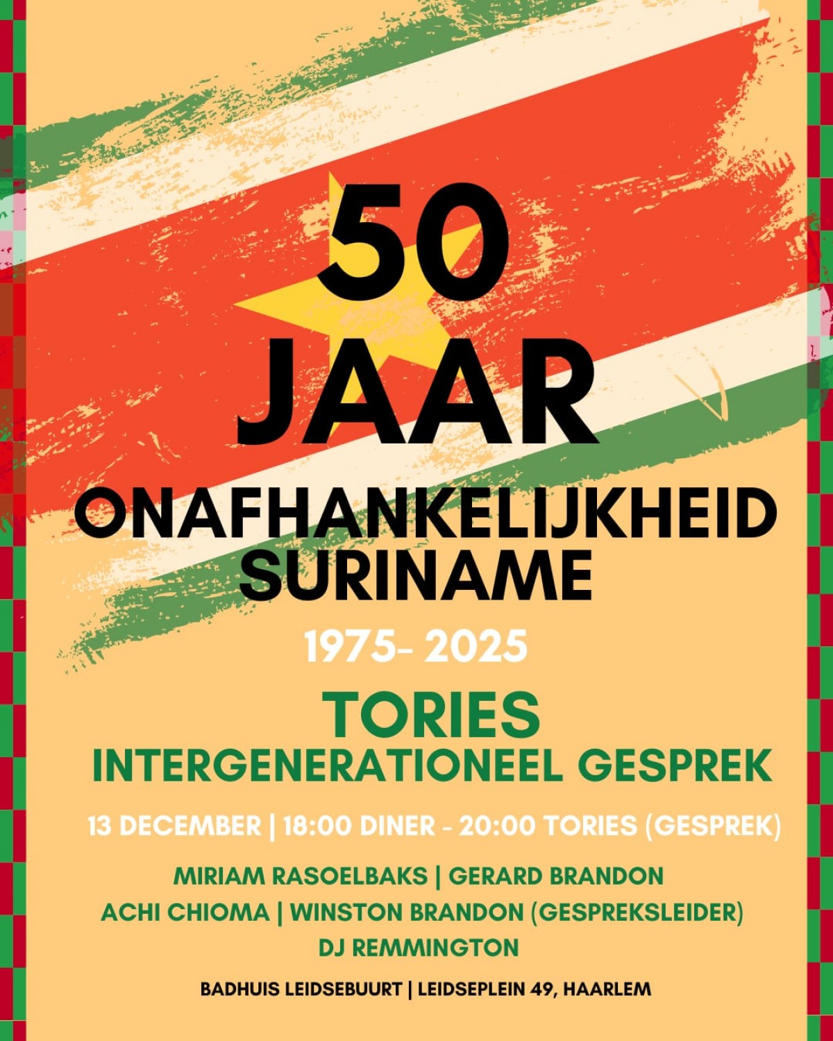 Winston Brandon gaat in gesprek met Miriam Rasoelbaks, Gerard Brandon & Achi Chioma over deze thema's. DJ Remmington zorgt voor een dansbare muzikale invulling. Vanaf 18:30 verzorgen we een heerlijk Surinaams diner waarbij iedereen welkom is.
