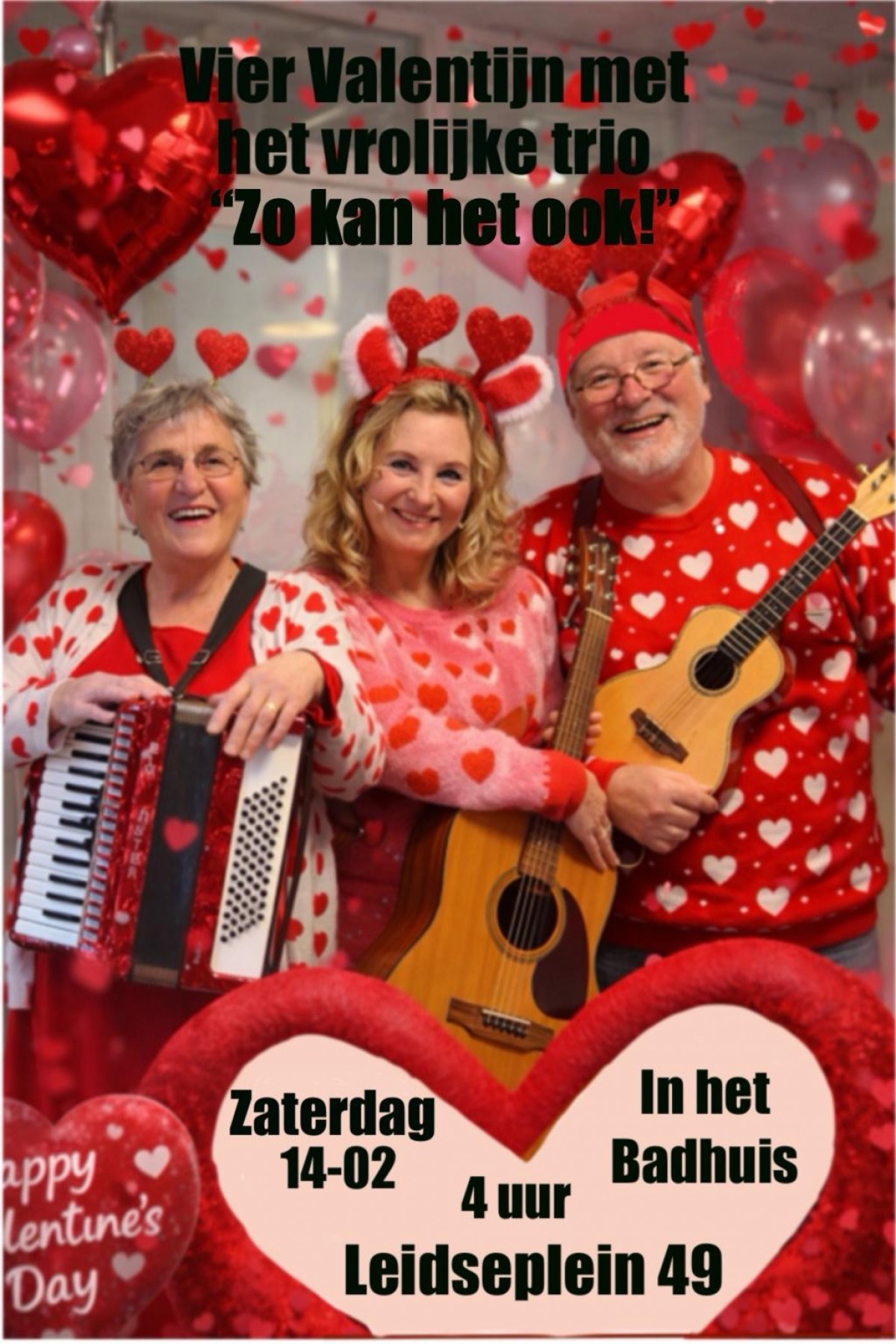 Deze Valentijn kan niet meer stuk, u vindt in het Badhuis uw geluk. Kom genieten van de mooiste en leukste liefdesliedjes inclusief verdrietjes o.l.v. Jessica van Noord ( zang en gitaar) met de muzikanten Jozeph (clarinet, ukelele, fluit) en Tineke Vlaar (accordeon). Samen vormen zij het sprankelende trio: "Zo kan het ook!" Omdat dat ook zo is. Je bent nooit te oud om te daten. Het wordt een romantische middag met ballades en meezingers en het trio gooit alles in de strijd om een Badhuis Vol Liefde te creëren . Kom gezellig luisteren, lachen, meezingen, dansen en speeddaten.